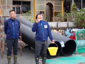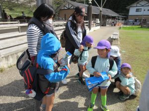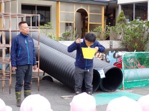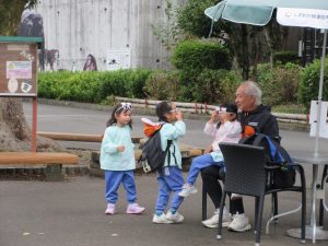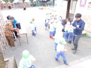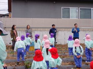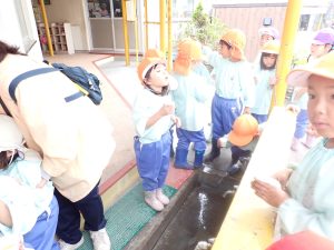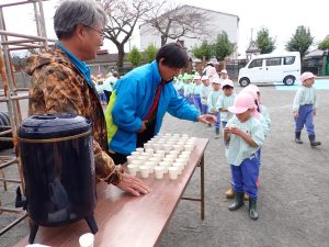 お芋ほりの後は、大淵茶部会のみなさんがお茶うがいを教えに来てくれました。これからインフルエンザや風邪がはやる時期、お茶うがいで体を守りましょう。