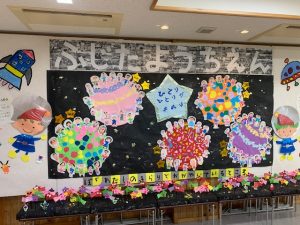 6月27日 6月生まれのお誕生日会、年中さん2名、年長さん3名のお友だちをみんなでお祝いしました。