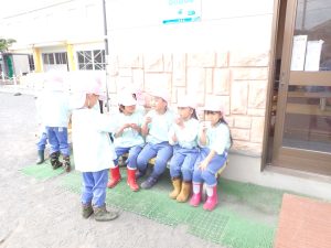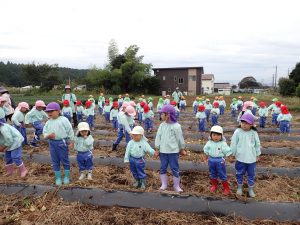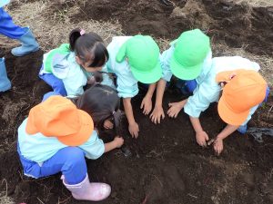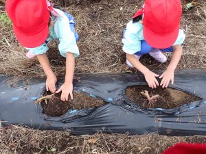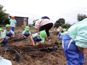 6月18日 芋畑に行ってきました。今年の芋つる挿しはあいにくの雨でできませんでしたが、みんなで芋畑に見に行くことに!たくさんのお芋ができるようにみんなでお願いをしました。11月の芋掘りが楽しみです。