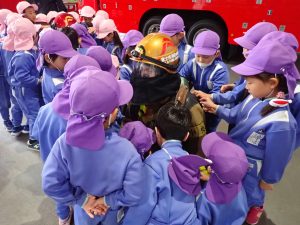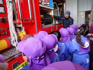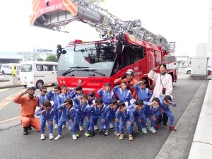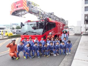 6月24日、大淵分署の消防士さんが、年長さんに花火教室を行ってくださいました。花火を行う上での注意点や消防服、道具の説明をしてくださいました。降っていた雨もやみ、年少さんと年中さんとみんなで写真や消防車の見学をしました。